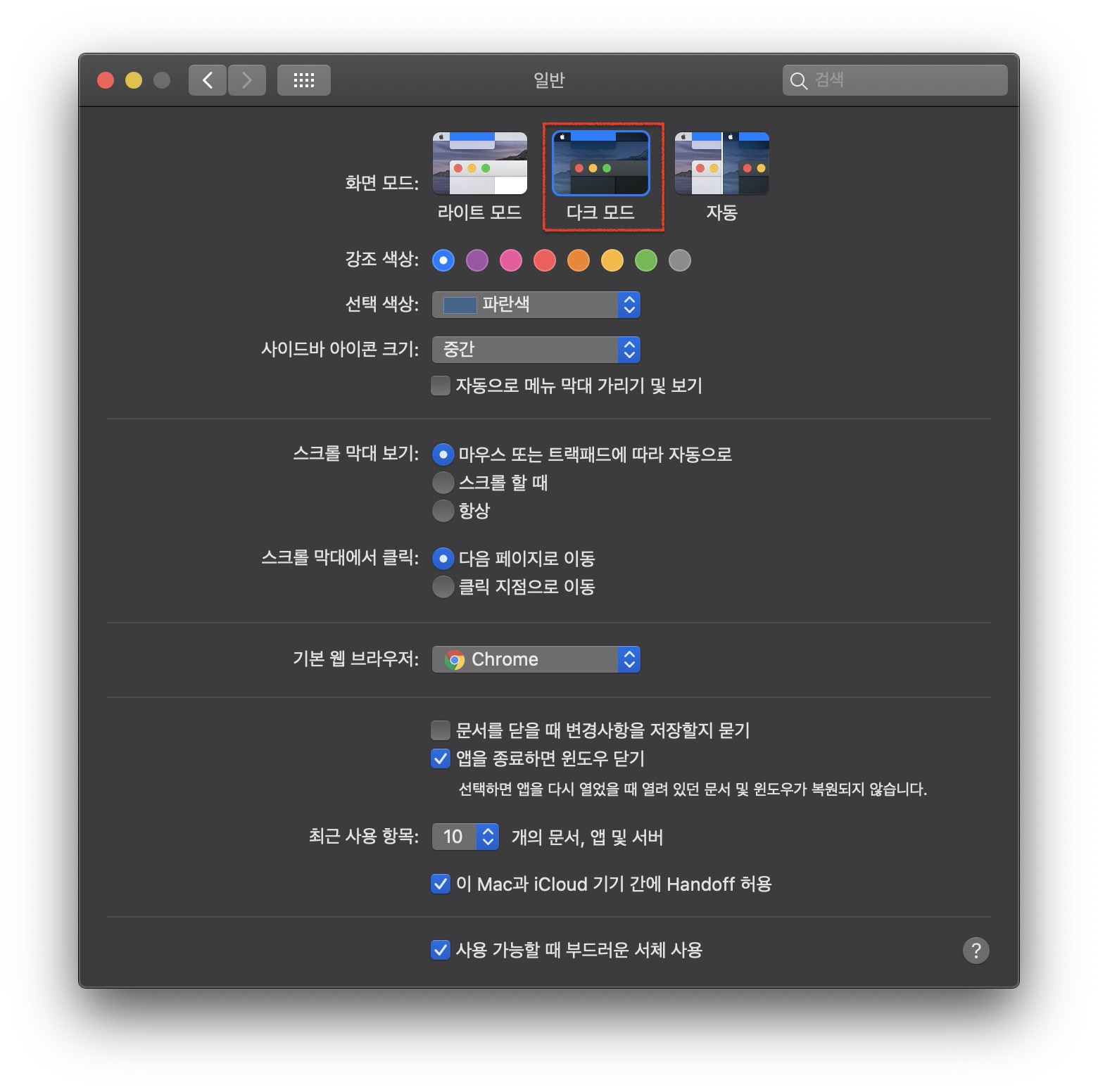 시스템 환경설정에 들어가시면 맨 위에 '라이트 모드 /. 다크모드 / 자동' 을 선택 하실 수있습니다. 이 곳에서 다크모드를 설정 할 수 있습니다.