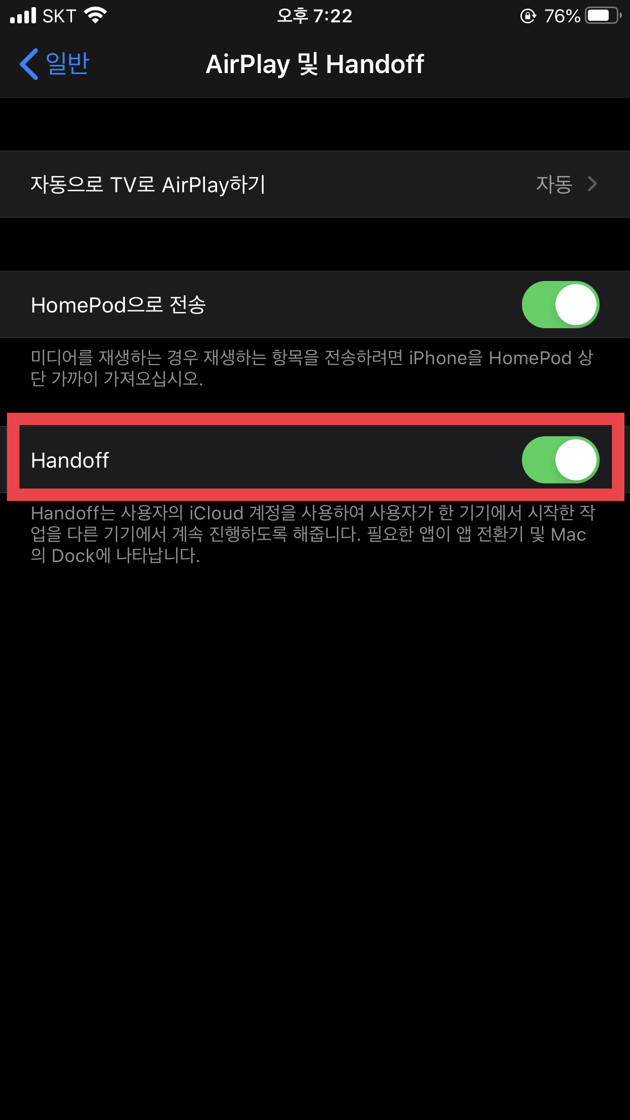 - 마지막으로 각 기기의 Handoff 기능이 켜져 있어야 합니다.